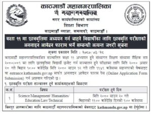 महानगरकाअनुसार आज बिहान १० बजेदेखि साउन १२ गतेसम्म महानगरको वेबसाइट वा entrance.kathmandu.gov.np मार्फत अनलाइन आवेदन फाराम पेस गर्न सकिने छ ।
