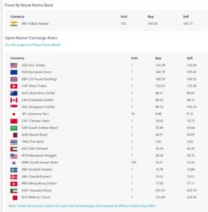 नेपाल राष्ट्र बैंकले आज (मंसिर १९ गते) मंगलबारका लागि विदेशी मुद्राको विनिमय दर तोकेको छ। अमेरिकी डलर एकको खरिद दर १३३ रुपैयाँ ०९ पैसा र बिक्री दर १३३ रुपैयाँ ६९ पैसा पुगेको छ। युरो एकको खरिद दर १४४ रुपैयाँ ७९ पैसा र बिक्री दर १४५ रुपैयाँ ४४ पैसा रहेको छ। बेलायती पाउण्ड एकको खरिद दर १६८ रुपैयाँ ७९ पैसा र बिक्री दर १६९ रुपैयाँ ५५ पैसा रहेको छ।