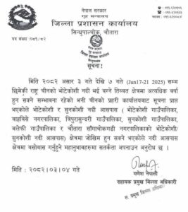 सिन्धुपाल्चोक प्रशासनले विज्ञप्ति जारी गरेर असार ७ गतेसम्म सतर्कता अपनाउन जिल्लावासीलाई अनुरोध गरेको छ । सिन्धुपाल्चोक प्रशासनले जारी गरेको सूचनामा तिब्बत क्षेत्रमा ‘अत्यधिक वर्षा’ हुन सक्ने सम्भावना रहेकाले भोटेकोशी र सुनकोशी नदी आसपासका ६ वटा पालिकाका बासिन्दालाई सतर्कता अपनाउन भनिएको छ ।