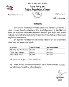 नेपाल क्रिकेट सङ्घ (क्यान)ले दोस्रो संस्करणको नेपाल प्रिमियर लिग (एनपीएल) का लागि टिकट बिक्री औपचारिक रूपमा सुरु गरेको छ। मङ्सिर १ गतेदेखि २७ गतेसम्म त्रिभुवन विश्वविद्यालय क्रिकेट मैदान, कीर्तिपुरमा हुने प्रतियोगिताका लागि दर्शकले विभिन्न दरमा टिकट खरिद गर्न सक्ने भएका छन्।